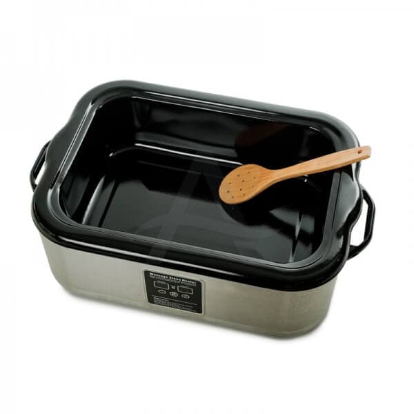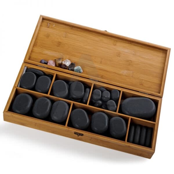 Hot stone heater 18 liter met digitale temperatuurregeling. Basalt-stenen set 64 stuks in houten doos: niet poreus, houden warmte vast tot 45 minuten. Stenen hebben helende eigenschappen. Inclusief houten spatel
