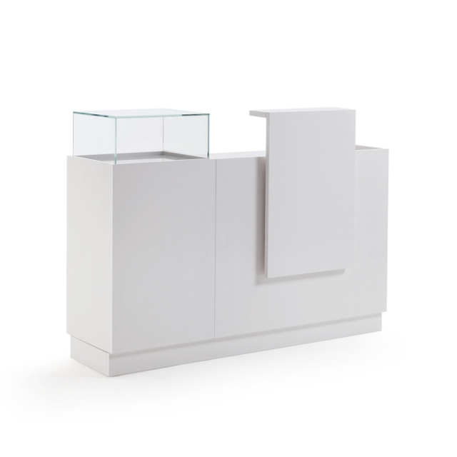 Model ' Light ' is een receptie-balie die opvalt door elegantie. Gemaakt van glossy white melamine materiaal. De balie kan worden samengesteld door enkel de centrale balie (Light Reception desk) of één of twee 'Light displays' toe te voegen. (rechts en / of links). De centrale module vormt de functionele basis: uitgevoerd met uittrekbaar paneel,opening voor doorgang kabel, lade met slot,deur, plank etc.