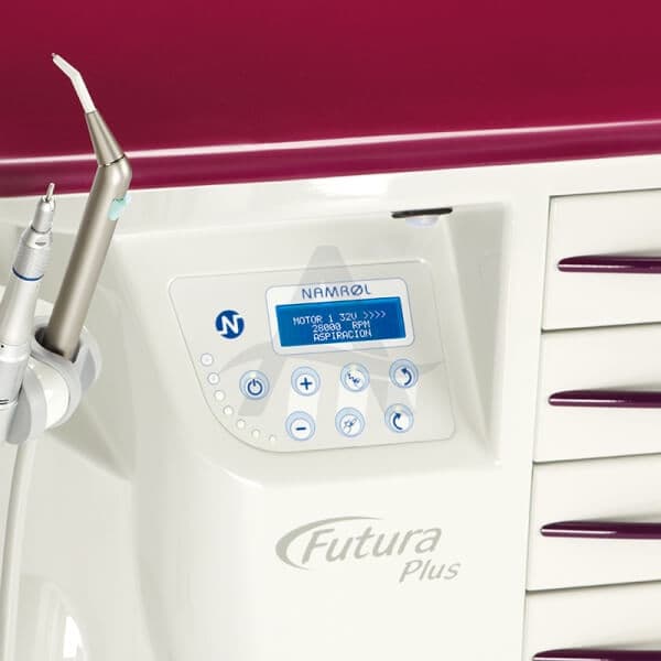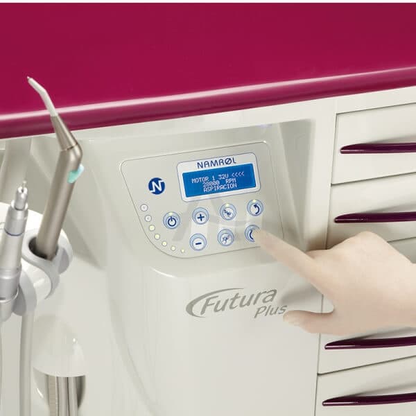 De Namrol futura podologie unit is uiteraard computergestuurd, dus digitaal bedienbaar. De instrumenten zijn via een ergonomische beugel bevestigd aan een degelijke extern geplaatste houder. De combinatie 'voetbediening en digitaal toetsenbord', maken het werken voor de podoloog eenvoudig en toch uiterst professioneel. Waarom zijn NAMROL units de beste ter wereld? Simpel, de kast (unit) is uit één stuk vervaardigd. Waar anderen de kast opbouwen uit losse panelen en aan elkaar bevestigen. De compressor kan op deze manier ook na 10 jaar nog altijd geruisloos functioneren. Er zal nimmer iets (los) trillen! In combinatie met NSK handstukken, motoren en boorslangen ontstaat er een eerste klas kwaliteit. De Namrol Futura unit is naar Uw wensen op te bouwen. Tijdelijk promotie op enkele units met de volgende samenstelling: