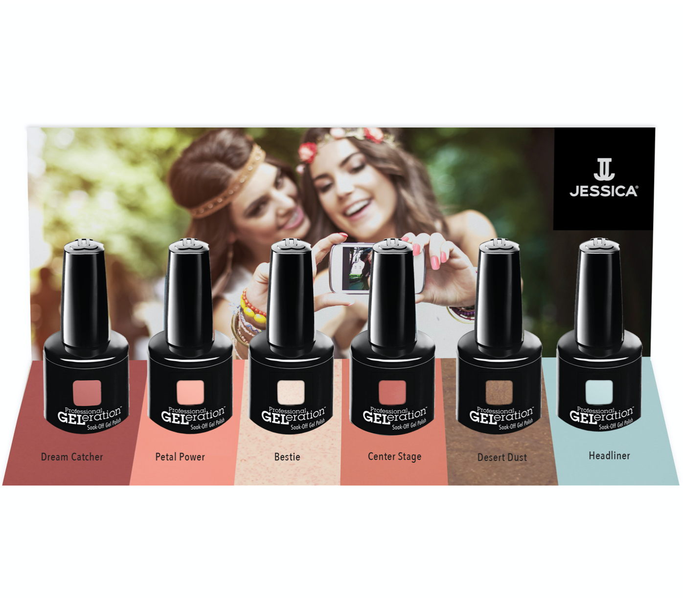 Jessica Geleration Indie Fest Display 6 stuks Bevat: 1x Geleration Dreamcatcher , 1x Geleration Petal Power, 1x Geleration Bestie, 1x Geleration Center Stage, 1x Geleration Desert Dust, 1x Geleration Headliner.