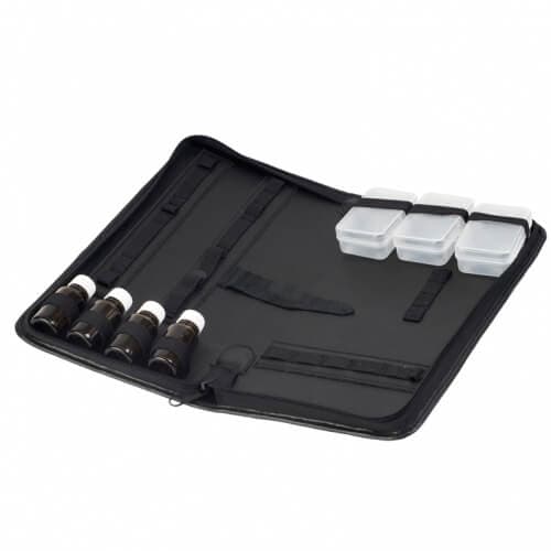 Pedicure etui zwart. Deze pedicure-etui is onmisbaar bij ambulant werkende pedicures. Let op, levering zonder inhoud echter wél met vier (4) vloeistof- flesjes.