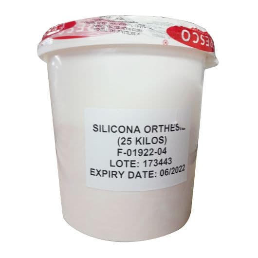 FRESCO Silicone Orthesil Bulk 25KG, Hardheid : Shore 30-32. Harde, oranje-kleurige elastomeer silicone voor corrigerende ortheses op maat van de patient. Kan ook gemengd worden met zachtere siliconen. Is bewerkbaar met een frees.