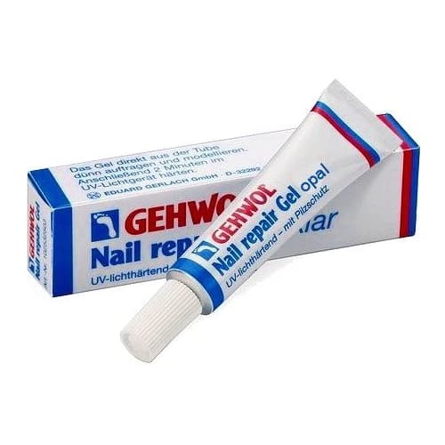Gehwol nail repair gel opaal (French). De gel met normale viscositeit kan een extra laag leggen over de kunstnagel of over de normale nagel, ter bescherming en/of effenen van het nageloppervlak. Moet nadien uitgehard worden onder UV lamp.